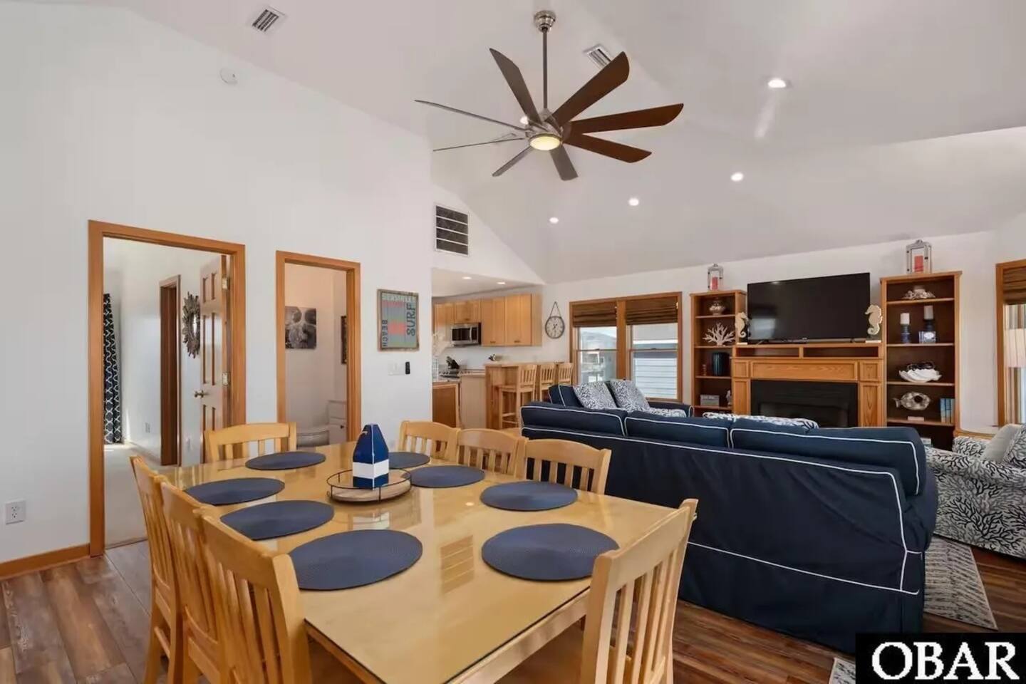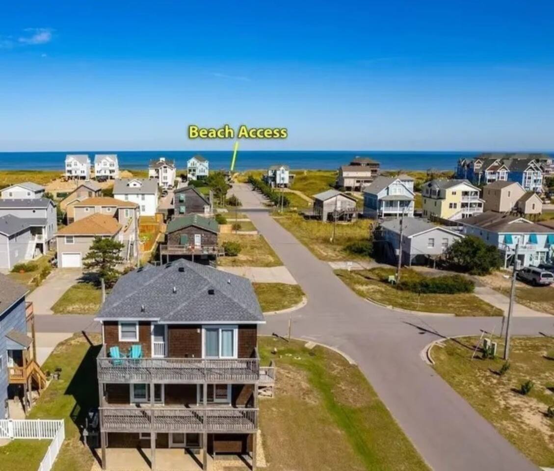 “Wright by the Shore” is a stylish coastal getaway in the heart of Kill Devil Hills. This spacious 4-bedroom retreat features two king suites and ocean views, plus a direct line of sight to the main beach access—just a 2-minute walk to the sand. Conveniently located near restaurants, shops, grocery stores, and the Wright Brothers Memorial. In the evenings, enjoy the pool table and arcade games in the entertainment area, or roast marshmallows around the fire pit—perfect for families or groups.